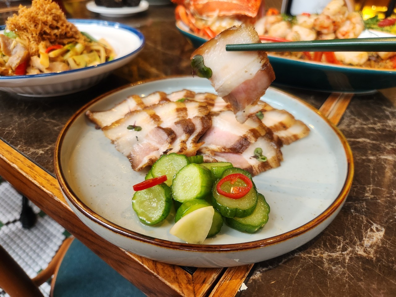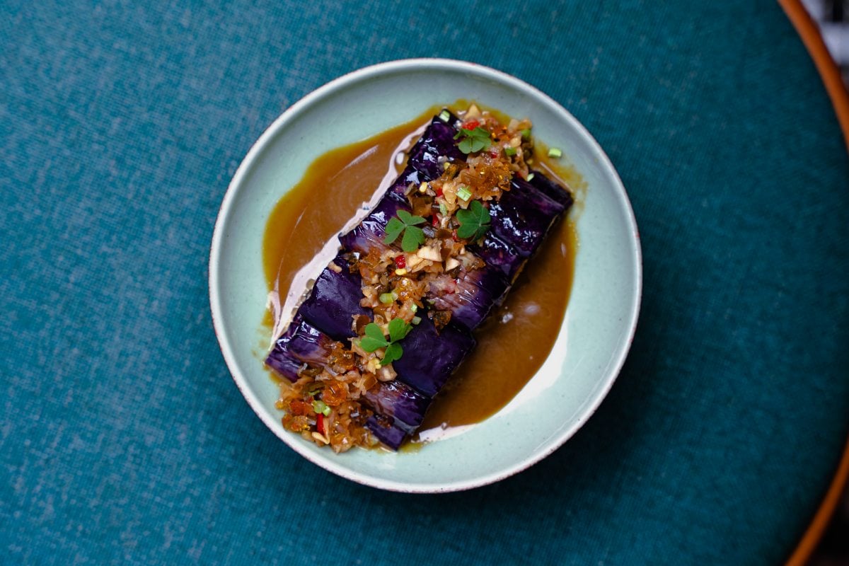 同要也是涼拌菜的「皮蛋剁椒茄子」,則是使用皮蛋黃與焦糖等製成的醬汁,講究的手藝將日常小菜提升到另個層次,鹹香帶點辣感的滋味,讓人吃一口就欲罷不能,不敢吃茄子的妞妞也能感受到全新滋味。