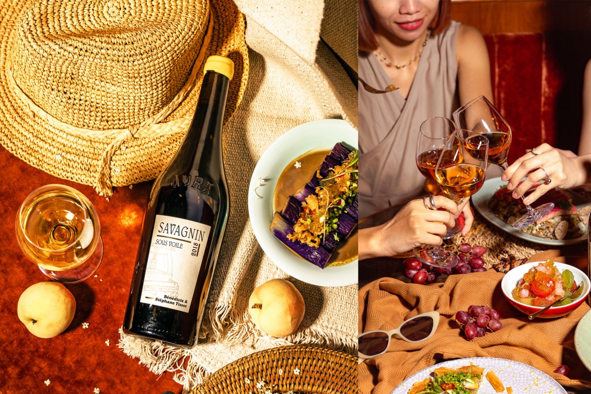 首先是法國侏羅黃酒「Jura Savagnin 2018」以Savagnin品種、Sous voile手法釀成,其味道多變,帶杏桃、杏仁、堅果風味,以及黃薑、芫荽籽、孜然等香氣,酸度鮮明最適合搭配台式料理,像是龍蝦茴香炒飯、黑鮪魚松露炒飯。