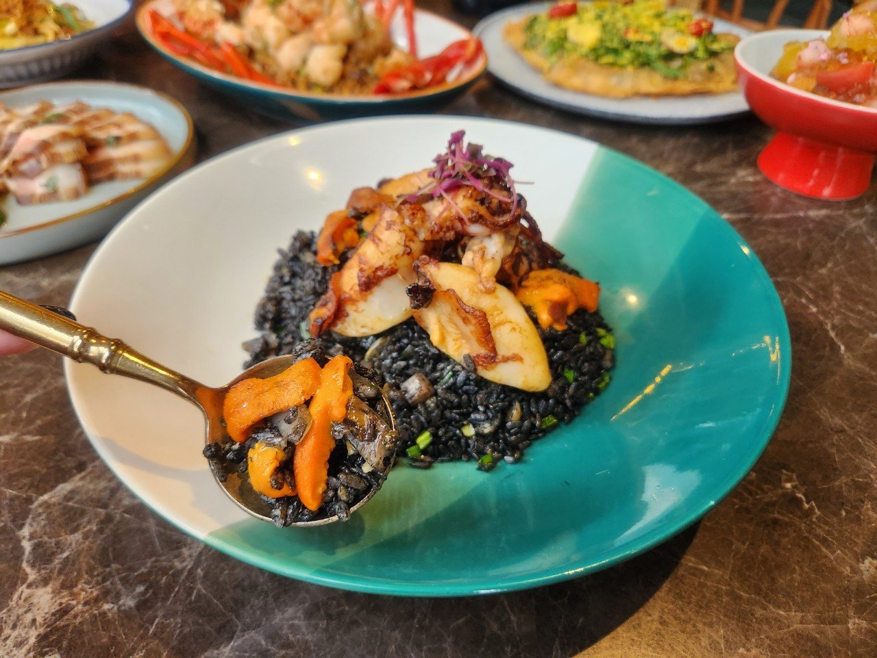 最後是海膽控不能不點的「海膽小卷墨魚炒飯」,以墨魚汁與多種海鮮貝類精心熬煮的醬汁拌炒入透抽佐澎湖小卷,最後覆上厚厚的海膽,濃郁的海潮之味把心神帶領前往海邊,光是聞到氣味就身心舒暢!