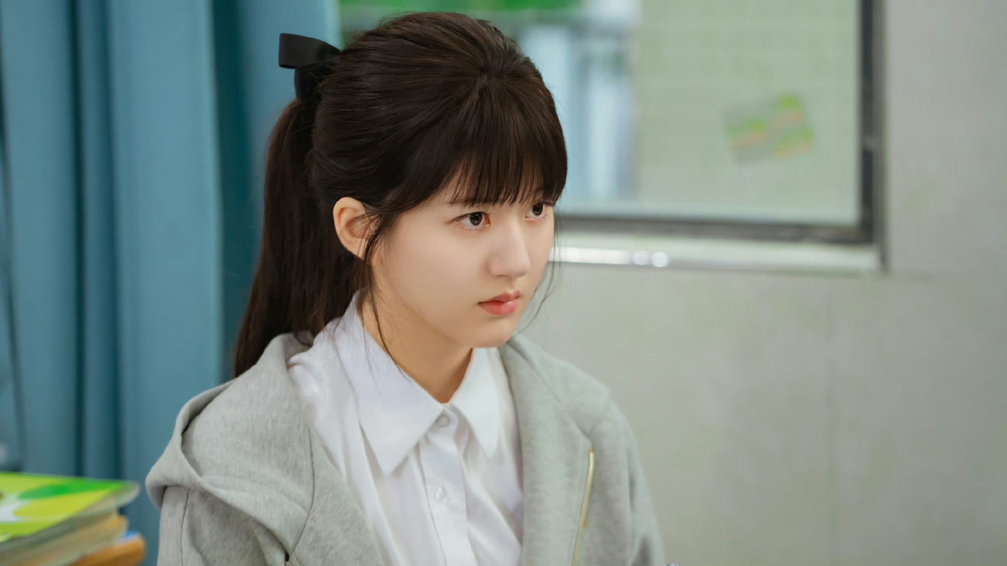 在高中時期的桑稚,穿著校服札著高馬尾+眉上空氣感瀏海,展現滿滿的青春活力。高馬尾要顯嫩好看,關鍵就在「蓬鬆度」,千萬不要把頭髮收得太乾淨緊貼頭皮,會看起來沒精神、又老氣,直接用手隨性把頭髮扎起來,兩側留一點髮絲修飾臉型,再搭配個黑色的蝴蝶結髮夾,低調中又能為造型加分。