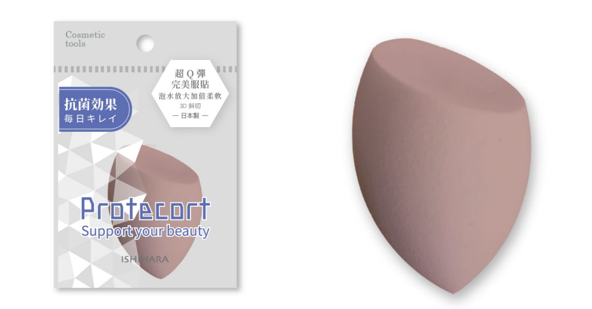 由寶雅獨賣的「Protecort抗菌美妝蛋」,是來自日本製的美妝品牌,特別採用3D造型設計,斜切面可以針對額頭、臉頰大面積上妝,蛋形弧面可以滾動式讓底妝更輕薄服貼,水滴的尖端則可以針對眼角、鼻翼上妝。