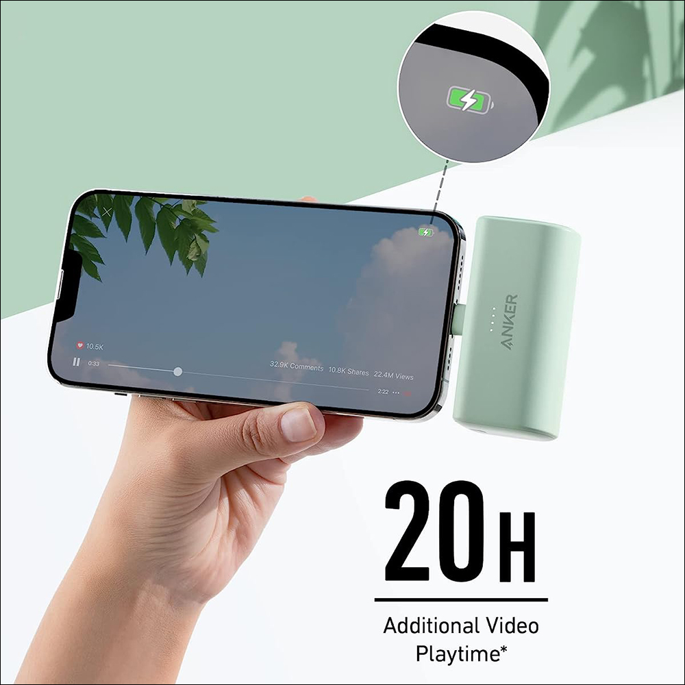 [caption id="attachment_498421" align="alignnone" width="1000"]同時因為 Lightning 充電接頭設計在行動電源上,一邊看影片、一邊充電的時候也不會有線材干擾手持的舒適度。這款 Anker 621 行動電源內建 5000mAh 容量,可以增加 20 小時的播放時間。