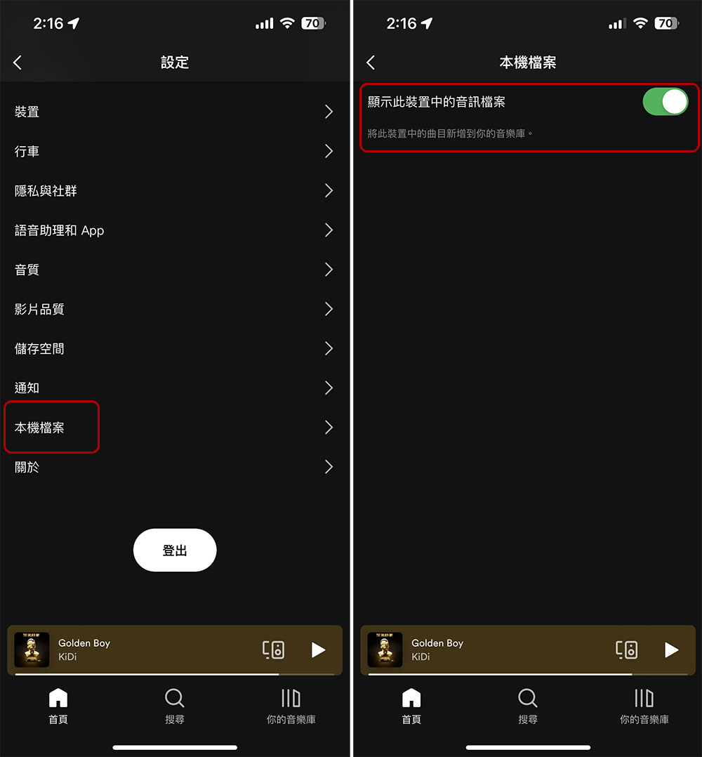 有時候,應用登入錯誤會導致本機檔案無法顯示於應用程式中,這種情況下請到 Spotify 應用程式裡面登出後再重新登入來解決問題。