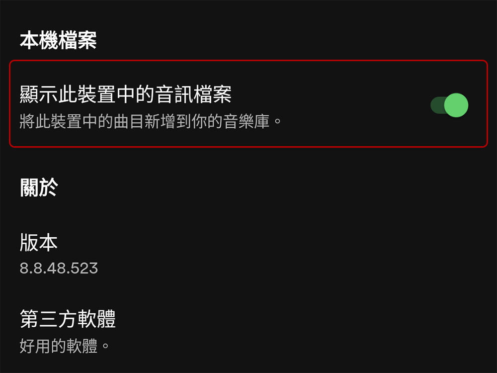 即使你的手機裡面確實有本機音樂曲目,想要在 Spotify 上顯示,你必須在手機中的 Spotify 應用程式裡面將該選項手動啟用。倘若沒有開啟(預設是關閉),則你看不到儲存在手機上的任何音樂。啟用方式如下: