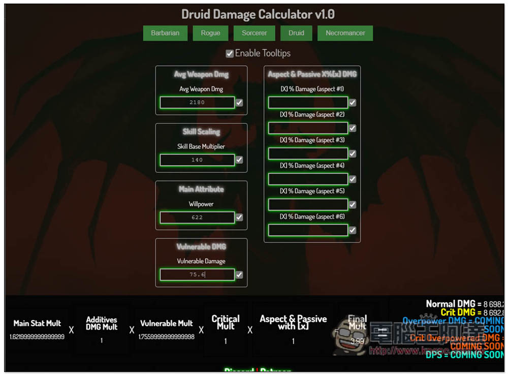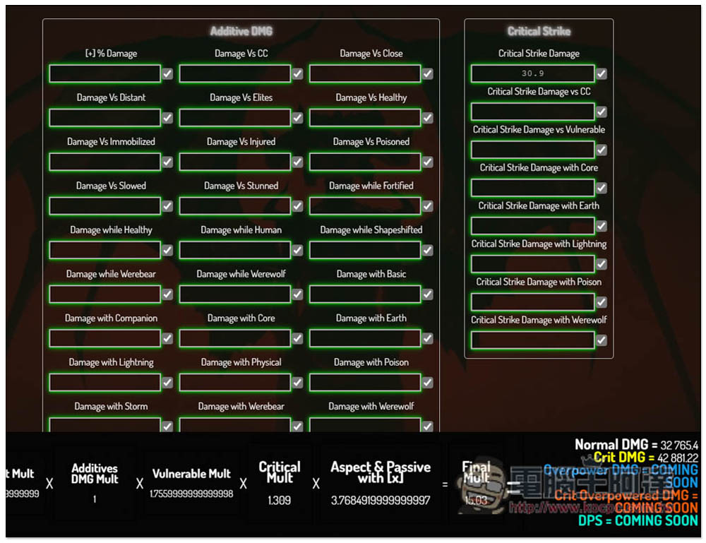 目前這計算機還有一些功能還沒推出,像是 Overpower DMG、DPS 等等。不過就如同前面曾說的,暗黑四的傷害算法很複雜,像是加上中毒條件之後,又會有其他傷害加成,算出來的數字參考就好,至少可以透過這個計算機來得知,該從那邊下手才能提升傷害。