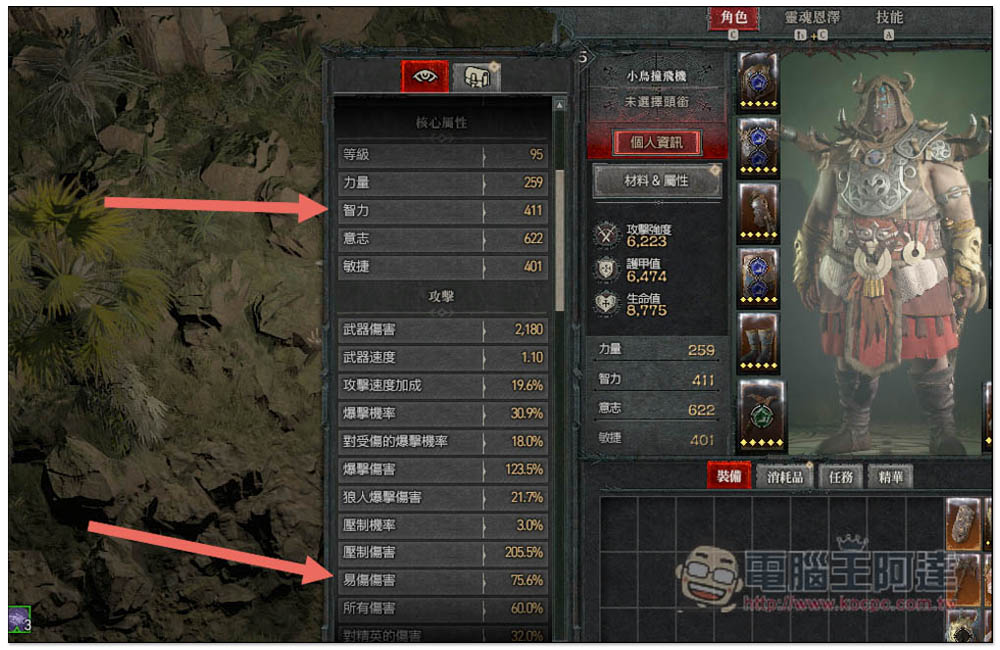 再來是主屬性,德魯伊主屬性是意志,所以我填 622,Vulnerable Damage 則是易傷,在攻擊面板下方可以找到,我的是 75.6