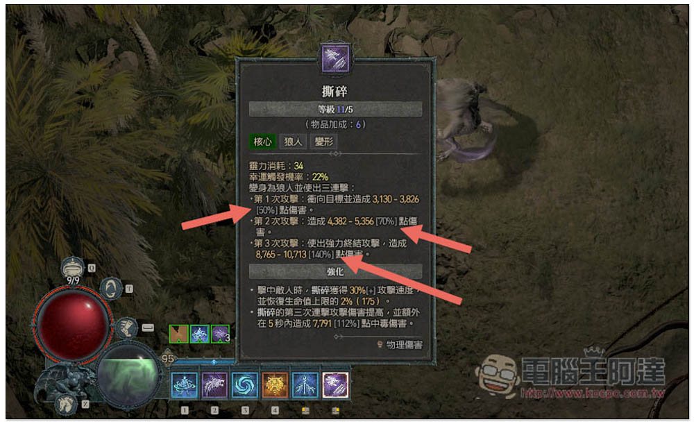 Skill Scaling 是你要計算的傷害技能,像我主要攻擊都是撕碎的核心技能,所以就算這一個,不過我這技能有分成三連擊,第三下傷害最高,可以達到 140%,我就算這一個:
