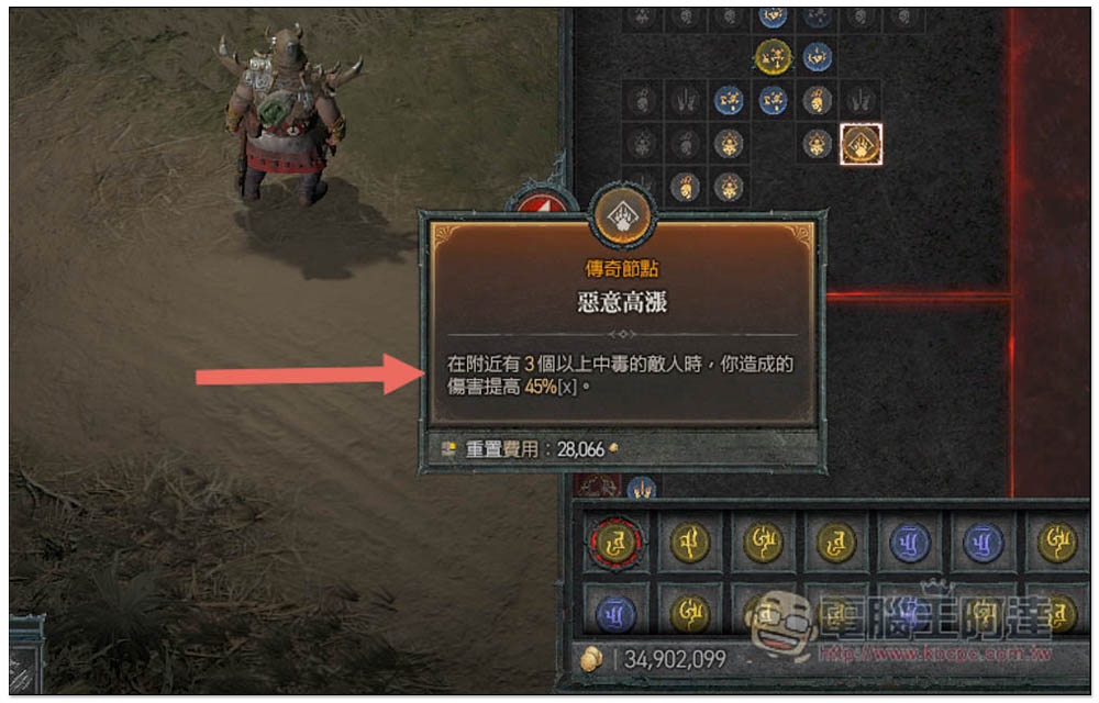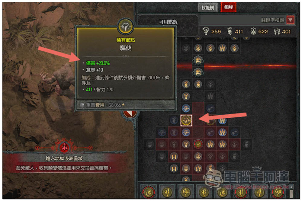 我的裝備並沒有加核心技能傷害,因此就直接看顛峰盤。我有啟用一個稀有節點,傷害有加 20%: