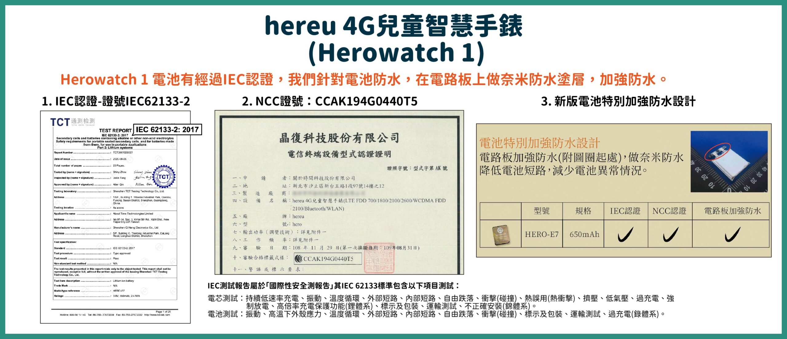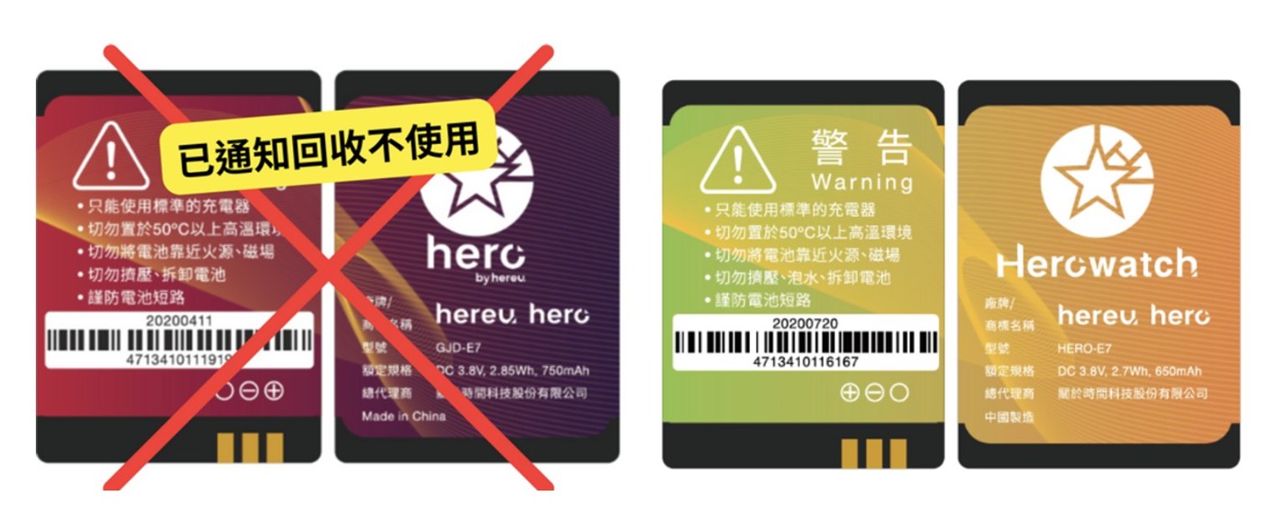 「Herowatch」廠商[About Time關於時間]則表示用戶使用的這款「Herowatch 1」產品於2019年12月開始銷售,並於2020年1月出貨第一批產品,搭配的電池為型號GJD-E7(如圖一,紅紫色外觀),此型號電池有經過IEC認證。此款產品「Herowatch 1」手錶電池為了方便性設計為開放式,消費者可自行拆卸,長期使用下若有碰撞、摔到等狀況可能產生肉眼無法辨識的裂痕,若遇到下雨或噴到水等狀況,可能會造成進水,長期下來皆有可能對電池造成損傷,進而讓手錶產生短路、產生意外。為了加強防水性,因此於2020年8月出產新款電池型號HERO-E7,新款電池於電路板加強防水與電路保護版安全措施增強防摔,將不會產生因進水而產生電池短路,杜絕意外發生;並於同年8月發布通知「Herowatch 1 用戶」可免費向本公司索取新版電池,且通知舊版電池自行回收不再繼續使用。從媒體報導照片初步研判,發生意外的手錶使用的電池為舊款型號,同時建議持有同款商品的用戶,可拆卸電池進行確認,若對於電池型號有疑慮,歡迎與本公司聯繫。(客服電話:02-2697-5818 / 官方LINE:@abouttime)