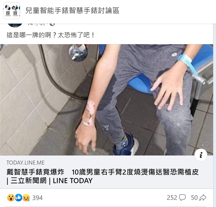 隨著科技進步,具定位及通話功能的兒童智慧手錶,近年成為關心兒童安全家長選購的熱門商品。不過,日前新北市土城區1名10歲男童的智慧手錶,不知何故突然爆炸,造成男童右手臂2度燒燙傷,恐需接受植皮手術,引起不少家長恐慌。