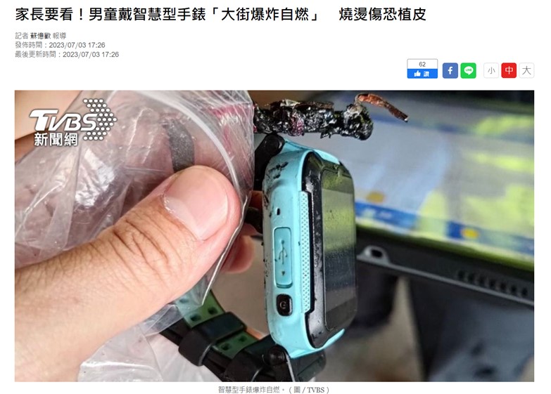 土城區1名10歲的小五男童,日前從家裡往補習班的路上,手上戴的智慧型手錶不知何故突然爆炸自燃,導致其右手前手臂2度及左手指1度燒燙傷。經好心店家幫忙塗藥膏,男童再前往補習班,補習班教師立刻打119並協助大量沖水,隨後由救護車送醫治療。