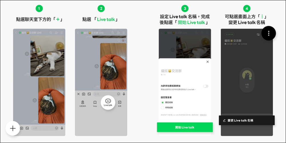 若在Live talk開始後希望變更Live talk名稱,請依序選擇畫面上方「 ⋮ 」>「變更Live talk名稱」