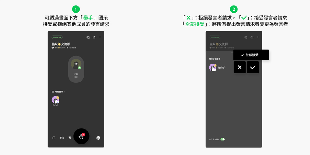 此外,點選「全部接受」可將所有提出發言請求的成員全部變更為發言者。