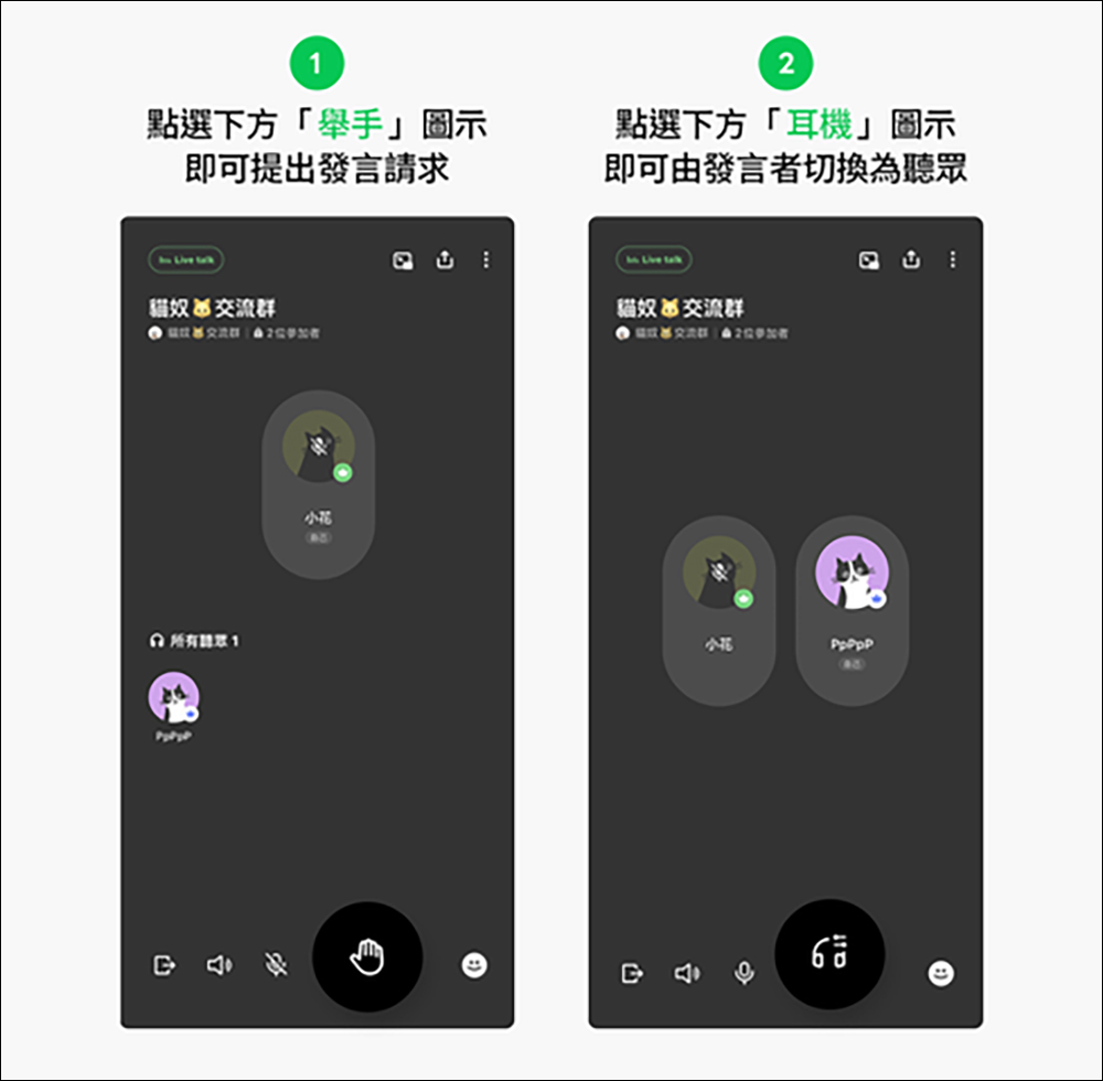 以聽眾身份參加Live talk時無法發言。若希望發言,請點選畫面下方「舉手」圖示提出請求。※非社群成員僅能以聽眾身分參加,因此畫面內不會顯示「舉手」圖示。當 Live talk 的發言者設定為「限定成員」時,主持人將會收到發言請求。獲得主持人核准並取得發言權限後,即可解除靜音開始發言。若希望由發言者切換為聽眾,請點選畫面下方的「耳機」圖示。