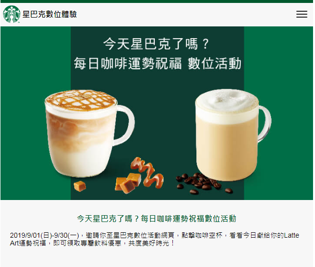 只要進到「星巴克數位體驗」的活動頁面,餅領取今日的 Latte Art 運勢祝福,活動期間內每天都可以得到專屬飲料優惠,快揪朋友一起體驗全球高品質連鎖咖啡品牌的「運勢祝福」!