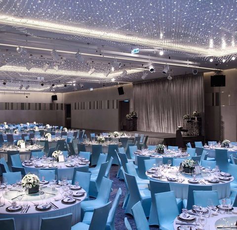 台北寒舍艾美酒店精心打造的奢華宴會空間,總面積1,620平方米、挑高五米,結合翡翠、珍珠、琥珀的大廳,最多可容納600位賓客。