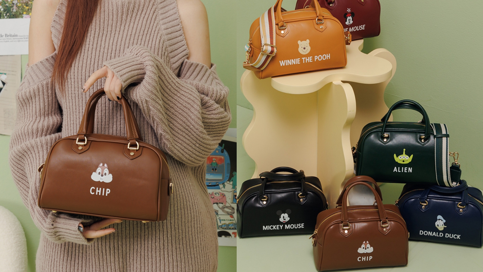 迪士尼鐵粉們尖叫!Grace Gift推出了眾多迪士尼角色的保齡球手提包,有米奇米妮、唐老鴨、奇奇蒂蒂、三眼怪和小熊維尼等6種款式選擇,包包表面印上了卡通人物的大頭圖樣,讓人一眼就能看到你心愛的角色,簡單又可愛,這款除了可以手提外,還隨包附上可拆卸的背帶,使用方法多變,喜歡迪士尼的人還在等什麼?快來挑選你最愛的角色包款吧!