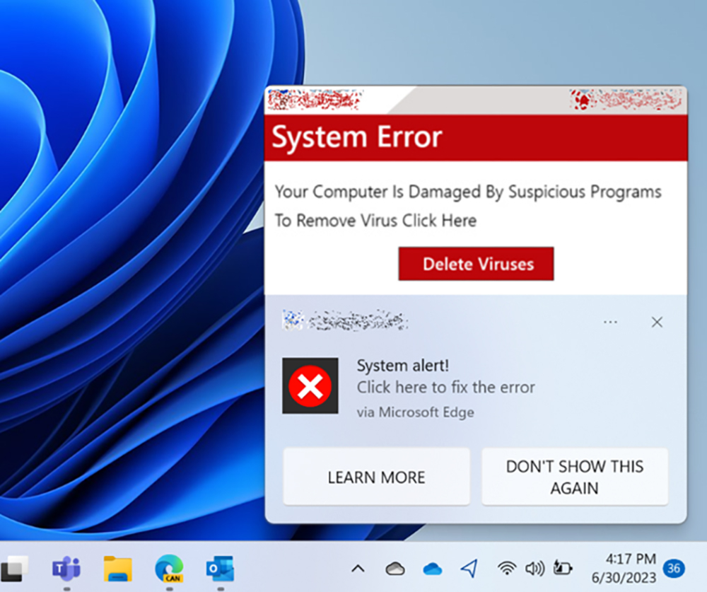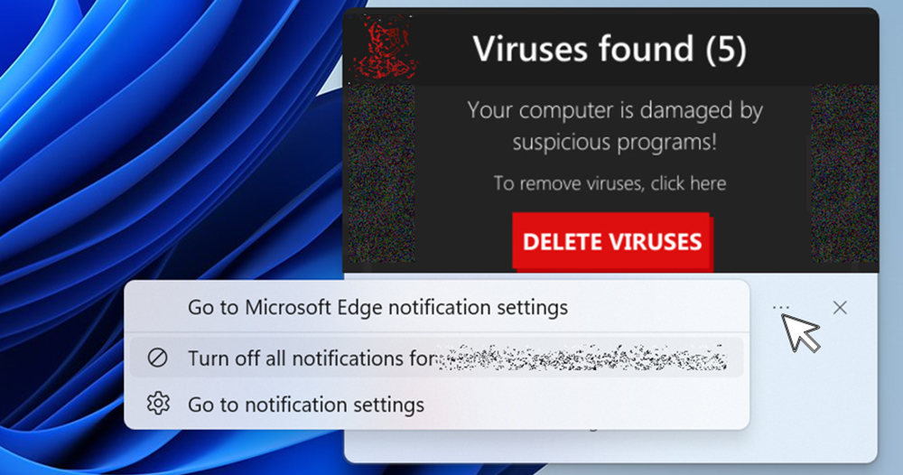 此外,當你允許網站進行通知(無論網站用什麼方法讓使用者答應)的時候,會有的詐騙/惡意訊息的範例。微軟則是舉了很常見的「你已中毒」的詐騙訊息。雖然這類的通知的確無法直接危害到使用者的裝置。而且其實一按「...」就會發現它其實只是一般的網站通知。