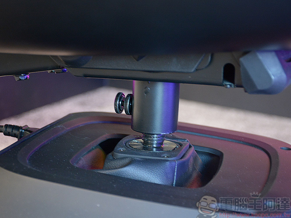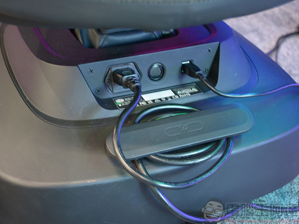 在底座後方則是電源插孔,開關,與電腦連線的 USB 插孔以及整線夾。當你想要當作一般座椅時,直接關掉開關即可不發亮也不震動。整線夾則能固定線材避免糾纏、滿地亂爬,保持整潔。。
