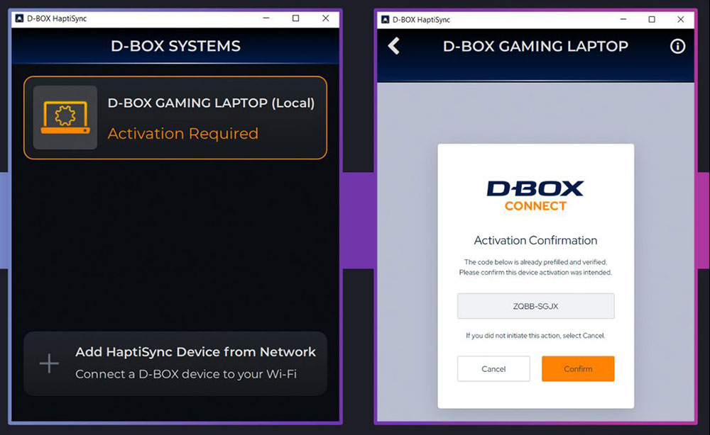 打開 D-BOX HaptiSync 應用,看到自己的電腦名稱以及 Activation Required 訊息,點擊它並跟著只是完成接下來的步驟,直到看見 Avtivation Confirmation。點擊「Confirm」,重新登入 D-BOX Connect 帳號。