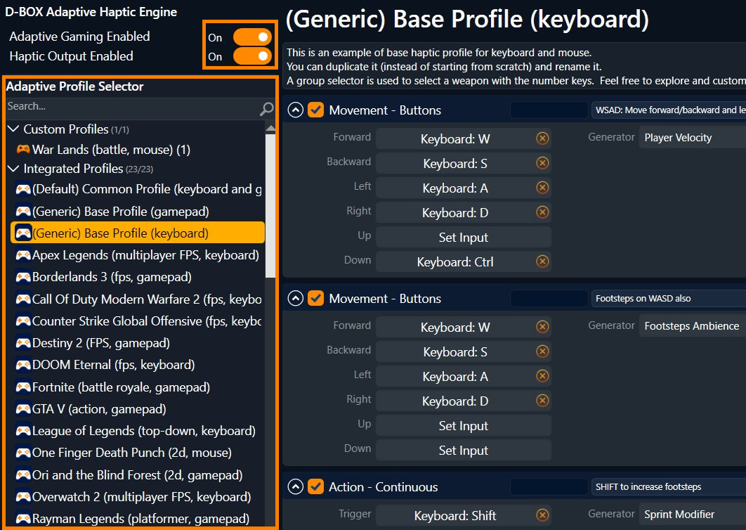 如果你想要透過搖桿、滑鼠或鍵盤的即時操作來觸發體感效果,在 MasterPlus+ 將體感模式選取為 Adaptive Gaming,並且點擊 Advances Mode Setting 開啟 Adaptive Gaming Configurator 後將 Adaptive Gaming Enabled 的開關打開。接下來你就可以在 Adaptive Profile Selector 中選擇一個內建設定檔以獲取特定遊戲的預設 IO 輸入設定,或是自己為喜歡的遊戲建立專屬的設定檔。
