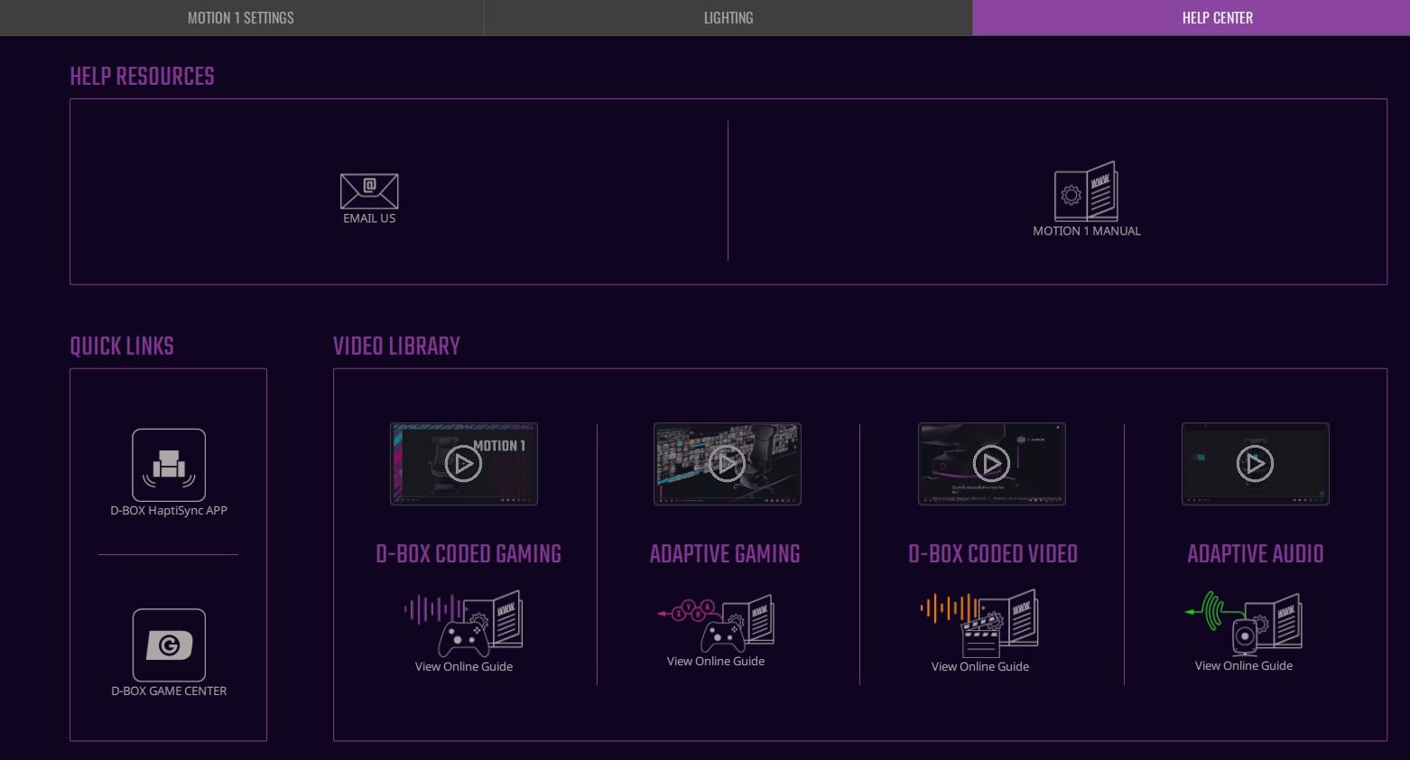 接下來會有四種體感模式的對應介紹影片來引導你進行最初始的設定,依據指示逐一檢視,並且點選 D-BOX HaptiSync 應用程式按鈕進入並執行設定,或是在之後於 Help Center 裡面檢視。好了!設定完成!