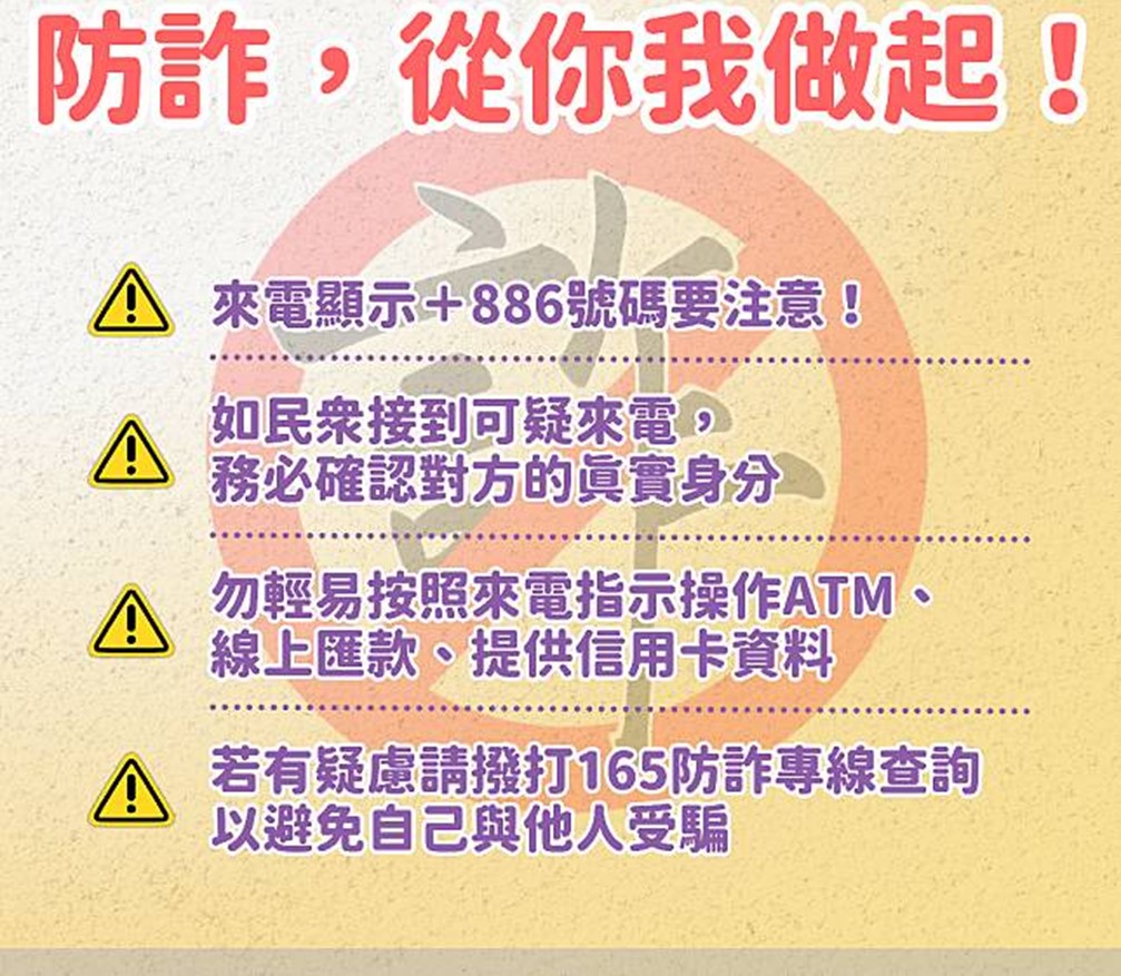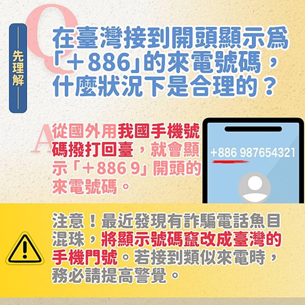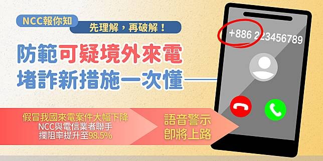 為降低民眾遭境外詐騙電話詐騙風險,國家通訊傳播委員會(NCC)推動「+886 9」開頭電話增加境外來電語音警示新措施,將於7月中下旬起,若市話接到常見偽造號碼開頭「+886 9」的境外電話時,將有語音提醒,手機部分則預計10月底起開始實施。