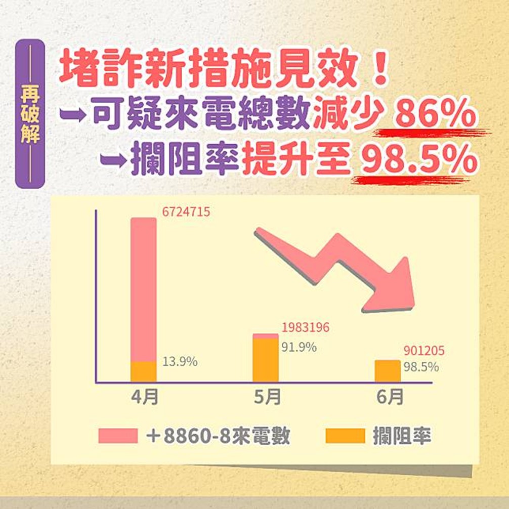 不過,還是不少民眾無法辨識而遭到詐騙,NCC進一步攔阻「+886 0~8」開頭電話,從4月起,協調電信業者在國際交換機,針對來電開頭顯示886 0-8的詐騙電話逕行攔阻,攔阻率從5月的9成2提升到6月的98.5%;可疑來電數也從4月的672萬多通,下降到5月的198萬多通、6月更僅剩90萬出頭,獲得不錯的阻擋成效。。