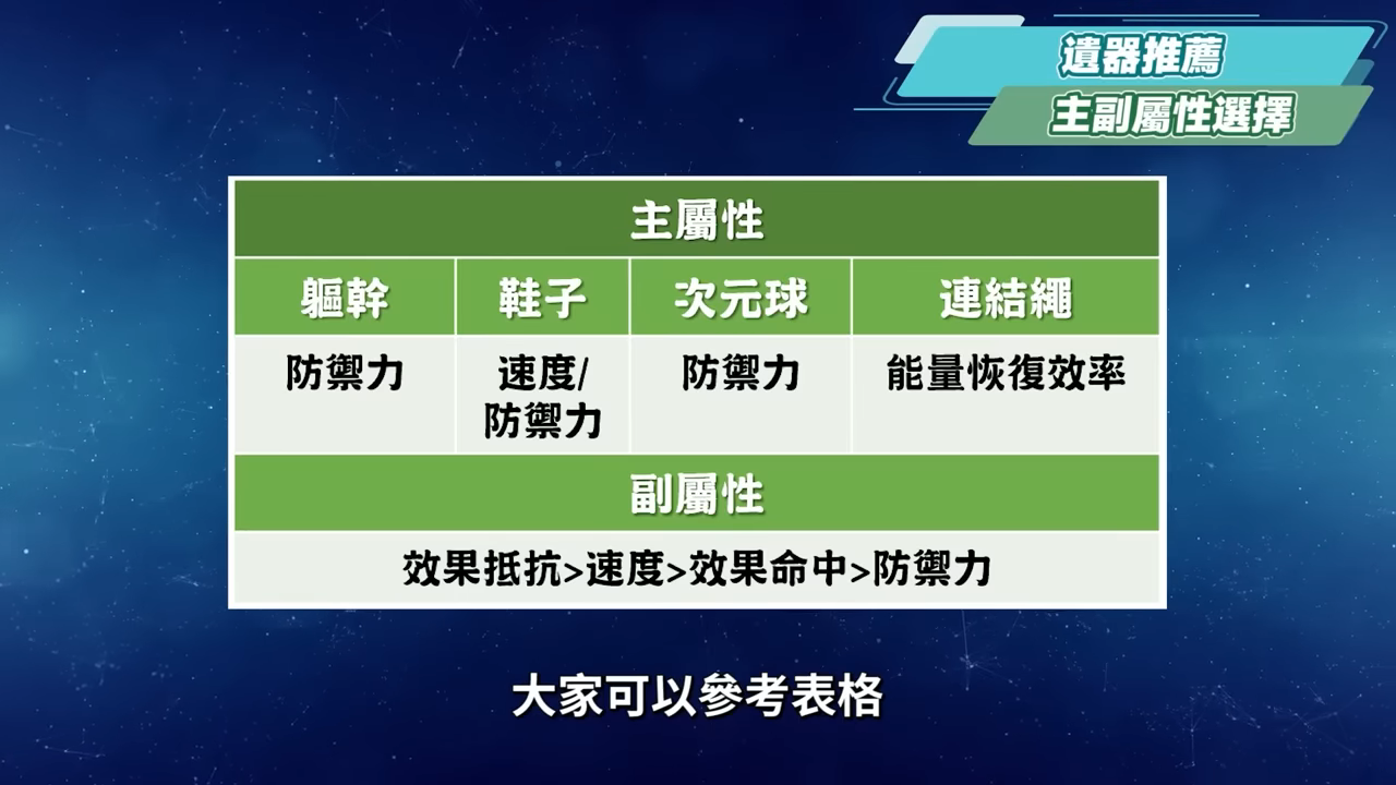終結技為傑帕德的核心技能,因此連結繩務必選擇能量恢復效率,其他則可以按照需求在副屬性方面提高效果抵抗與效果命中。