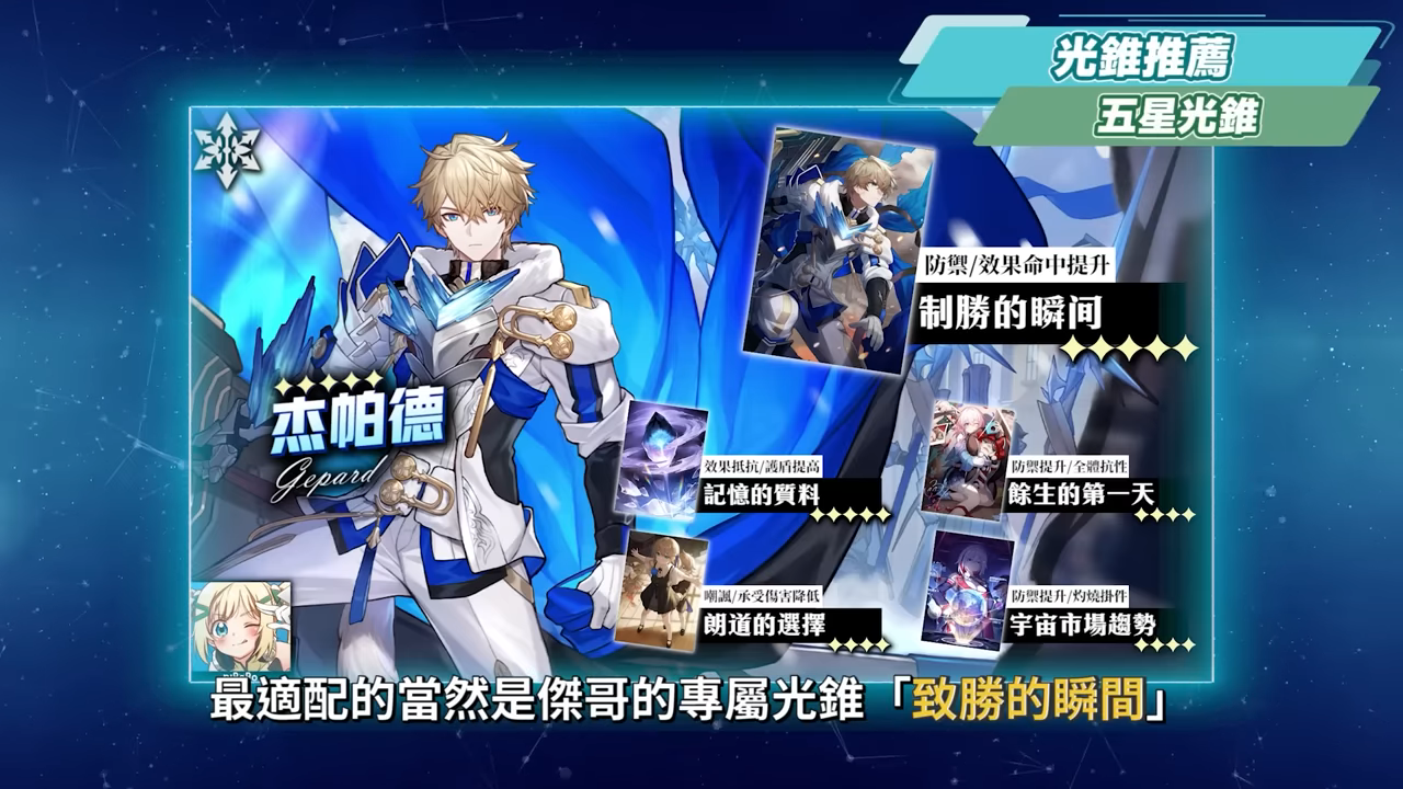 傑帕德的光錐推薦部分,最適配的當然是傑哥的專屬光錐「制勝的瞬間」,除了白值優勢外,還能提高防禦力、效果命中和受擊概率,基本上就是完全量身訂製的光錐,受擊後還能再增加防禦力,額外增加護盾厚度,若有的話可以直接帶上,或是可以先在星芒商店先兌換一個出來,若是星芒不夠的話,畢竟是常駐光錐,未來也是有機率能再獲得的。其他的五星光錐還有在黑塔商店能免費兌換的「記憶的質料」,提供效果抵抗,以及在傑哥有護盾時提供減傷、沒護盾時根據生命值自動生成一個護盾,也是能加強傑哥自身的生存能力,也因為是免費兌換,若是平民無課玩家也可以考慮在這邊兌換到滿疊影,可以自行斟酌與其他光錐的效果。
