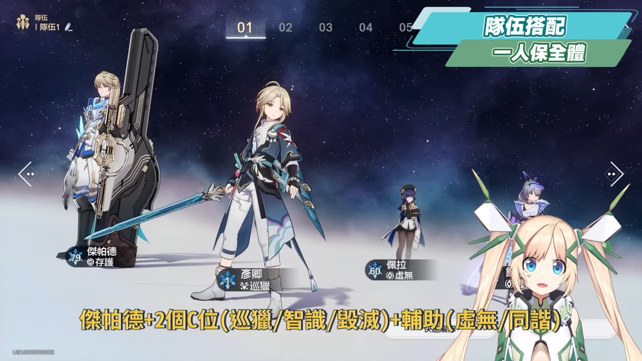 第一種是傑哥一人扛起保護全隊的責任,因此組隊架構就可以是:傑帕德+2個C位(巡獵/智識/毀滅)+輔助(虛無/同諧),在戰鬥前最好先上秘技,進入戰鬥後就有全體護盾,而這個隊伍會比較偏向能夠快速解決敵人的陣容,拖越久的戰局會越來越不利,同時也因為隊伍中只有傑哥擔任生存位,因此就比較不建議放入希兒這類速度快,或是布洛尼婭這類提前行動消耗回合數的角色。
