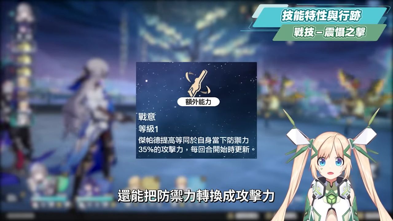 傑帕德的額外能力「統領」,可以在傑帕德倒地復活後直接回滿終結技再施放,提高戰鬥容錯率,算是額外能力中最實用且建議優先點出的技能,在前期開荒或越級打怪時能發揮奇效。而「剛正」則是能夠增加受擊概率,除了幫隊友吸引火力之外,也能增加傑帕德終結技能量回復的效率。最後「戰意」的部分則是能夠讓傑帕德在每回合將部分防禦力轉化為攻擊力,比較有影響的是能夠稍微增加普攻和戰技的傷害,但加得也不算很多,所以主要是當作點後面額外行跡效果的一個過路收費站。