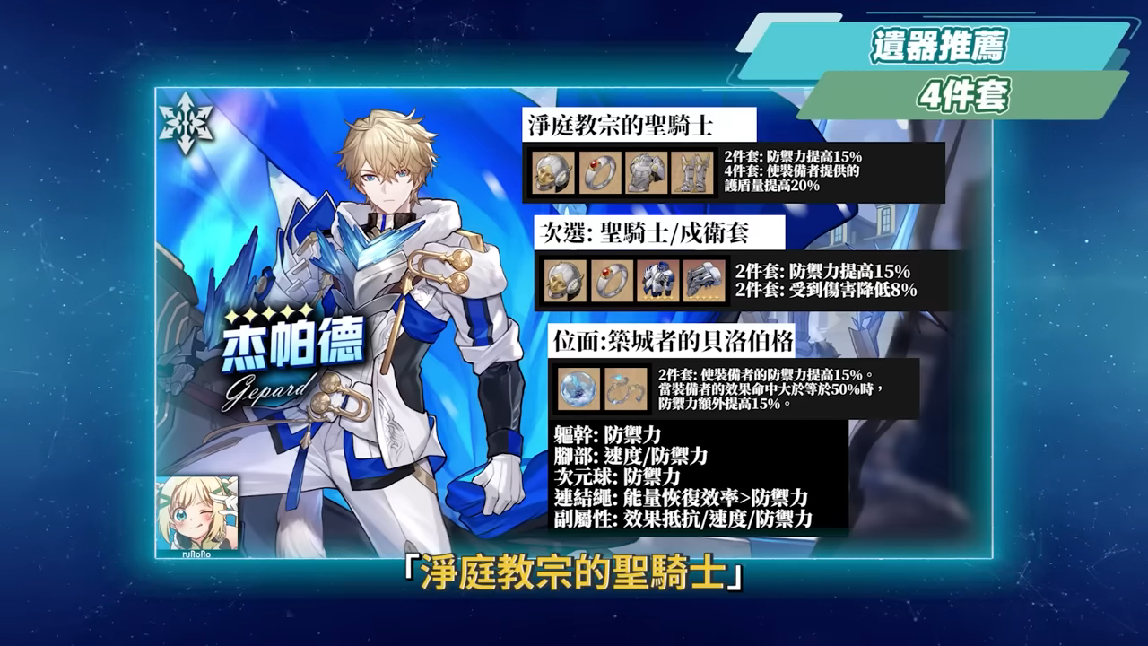 傑哥的遺器4件套首選推薦為「淨庭教宗的聖騎士」,不論是2件套還是4件套的效果都與傑帕德的能力高度契合,而若是要採用2+2的過渡搭配的話也可以是「聖騎士」2件搭配「鐵衛套」2件。