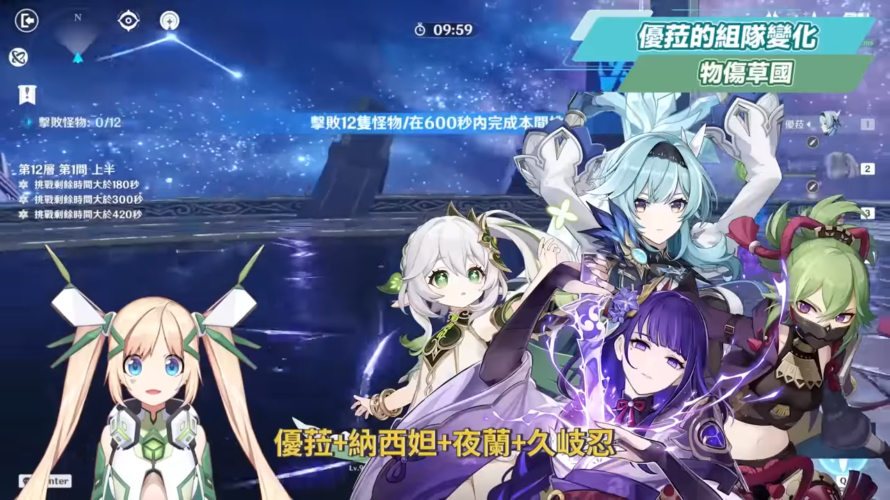 最後就是優菈加入草國隊的陣容組成,優菈+納西妲+夜蘭+久岐忍,這隊的好處是主要傷害不是優菈在扛,每個人都有傷害,並且優菈擔任草國隊的駕駛員時也不會和草元素反應互搶,也適合給一些非滿命的優菈一個下限較高的組隊方式,不過以草國隊來說還有其他更適合的駕駛員,所以優菈搭配草國隊主要是讓優菈的組隊有更多的變化性,這一隊中假如納西妲有2命的話,還能夠透過激化反應給敵人降低防禦30%,能帶來非常可觀的傷害,久岐忍的掛雷也能提供給優菈做超導、夜蘭的大招也能給優菈做增傷,同時搭配草國隊總體的傷害,也是一個能攻略深境螺旋的低命優菈組隊選擇,也因為優菈不再是主要傷害擔當,若是元素充能不夠的話也可以考慮使用充能主屬性的大劍。