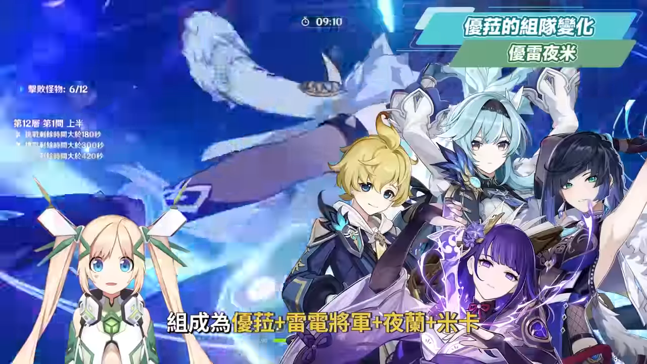優雷夜米的組成為上一隊的變化,主要是將蘿莎莉亞換成夜蘭,組成為優菈+雷電將軍+夜蘭+米卡,輸出手法為雷電將軍E→優菈E→夜蘭EQA→米卡QE→優菈Q接輸出,夜蘭在這一隊也是需要要求充能,若能1命以上會更好。