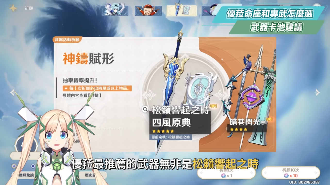 而武器方面,優菈最推薦的武器無非是松籟響起之時,提供最高的武器白值與物傷加成,抽到外觀也直接畢業,拿著專武的優菈在跳舞時、和拿著非專武的大劍在跳舞時,那個觀賞度真的有差。不過因為這次3.8復刻的卡池與松籟一同加倍的是可莉的專武四風原典,這個是常駐池有機會就能抽到的武器,又或是可能已經很多玩得久的人手上也都有一本了,因此這次武器池可能就不是太好,而如果兩把武器都沒有的話,還是可以試著抽抽看,畢竟四風原典還是可以給輸出型的法器角色使用,主屬性也提供的是珍貴的暴擊率,所以有一本或兩本還是不錯的,原石足夠的話做好吃滿定軌的準備,應該還算可以接受的範圍。