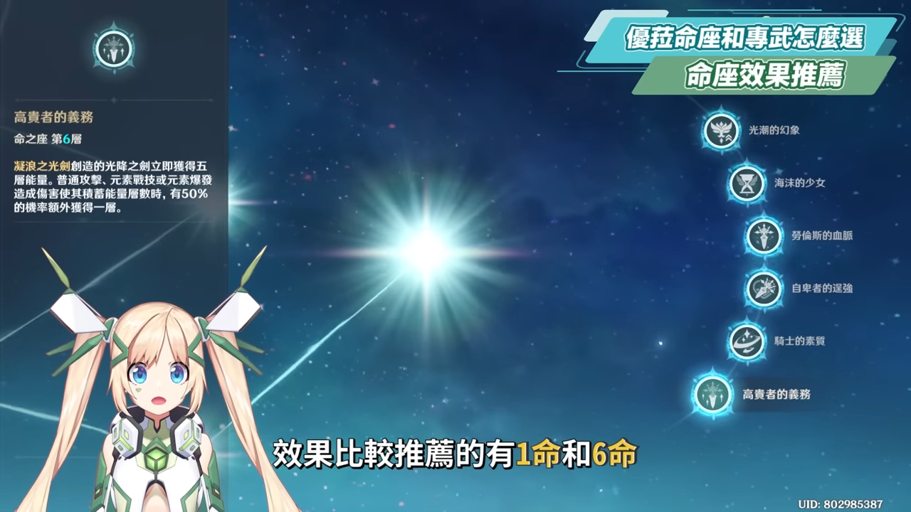 如果看完前面關於優菈的7個心理突破點,還是決定要抽優菈的話,接下來可以再看看洛洛的命座+專武搭配的抽取順序建議,優菈在命座上,效果比較推薦的有1命和6命,2命主要可以優化手感,可以開始穿蒼白之火4件套,非2命的優菈會比較建議先穿蒼白之火+染血套2+2來過渡,或是另外2件搭配攻擊力加成的聖遺物套裝,6命就是能讓疊層有機率直接雙倍,最後宇宙大核爆的效果不需多說,而1命也蠻推薦的原因是在於能帶來初步顯著的傷害加成,只要消耗E技能的冷酷之心效果就能直接提升物傷30%,其他非6命的效果比較一般,不如直衝滿命。