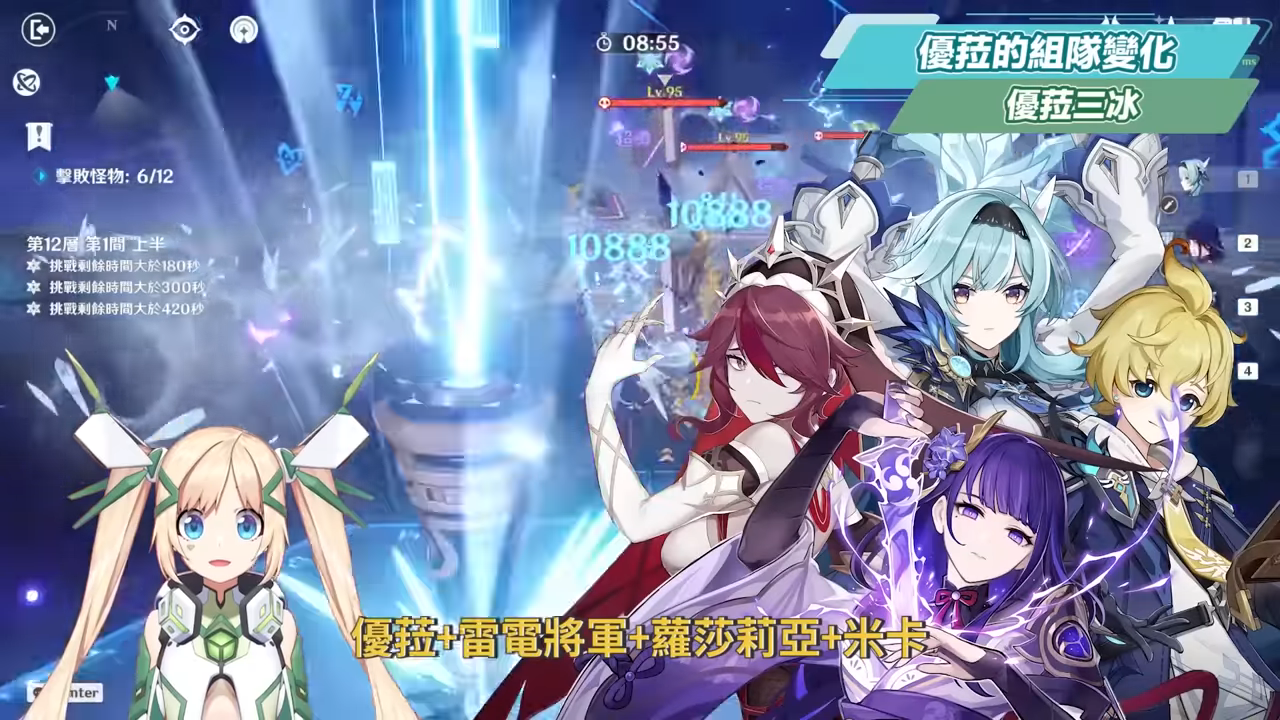 優菈三冰隊的組成為優菈+雷電將軍+蘿莎莉亞+米卡,主要是米卡加入後的隊伍陣容,能夠解放1班尼特的位置外,在面對一些過動的敵人時,搭配米卡也比較不會像班尼特那樣容易有畫地為牢的窘境,輸出手法可以是雷電將軍E→優菈E→米卡QE→蘿莎莉亞Q→優菈Q接輸出。