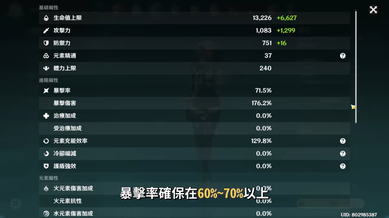 優菈的畢業面板參考,暴擊率確保在60%~70%以上,因為大招萬一空大就尷尬,所以建議是70%以上最好,暴擊傷害則可以在150%~200%左右,攻擊力若是拿專武松籟或是狼的末路大概可以來到2300~2400左右,而若是非專武則會建議攻擊力最少在2000以上,也因為優菈是主靠大招打傷害的,能量需求80點的優菈也可以靠副屬性加減堆疊一些元素充能效率,大約可以堆到120~130%左右,不太建議直接穿充能沙,用副屬性的即可。