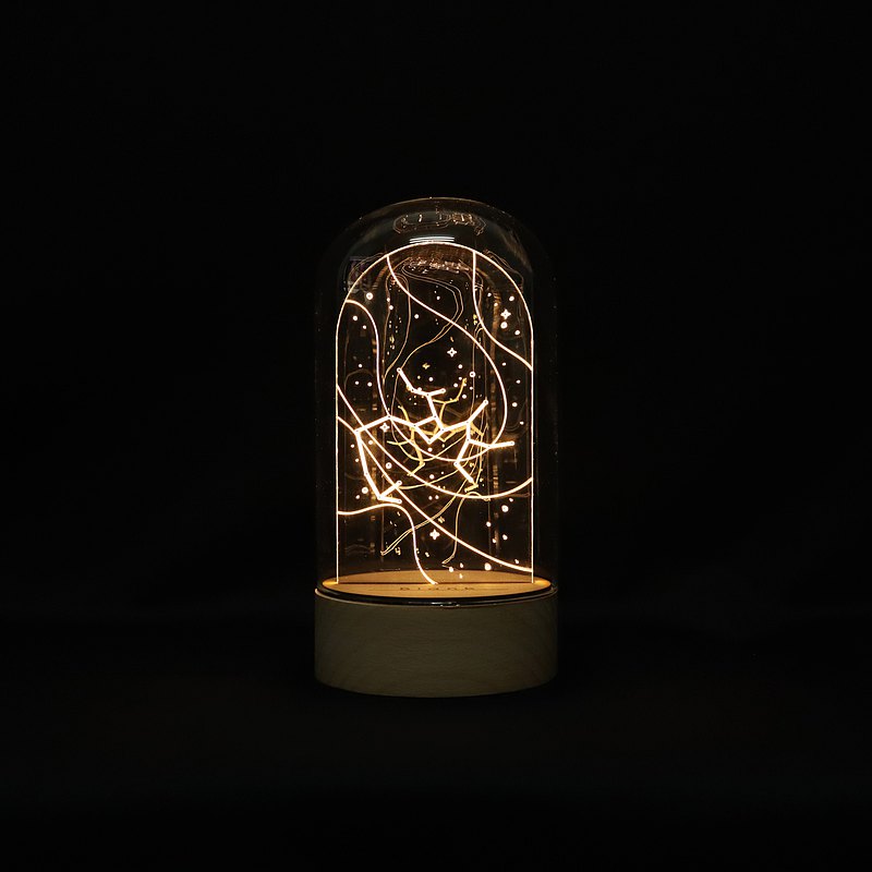 這款原木夜燈,不只能夠自用也適合送禮,材質主要使用的是:壓克力膠片,木板、USB 電源線、木底座和玻璃罩,圖案為巨蟹座的星座紋,每個星點還可以放入耳環,當成耳環架使用。而木製底還可以依照需求刻上各種文字,變成個性化又獨一無二的禮物。