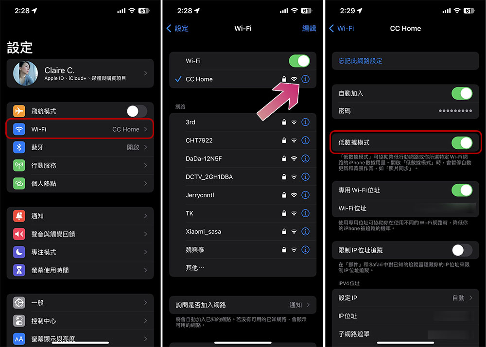 由於在 iPhone 中低數據模式並不在一個統一管理的介面中,所以接下來筆者會把 Wi-Fi 和行動網路兩塊分開來,讓你更好地學會兩種不同網路連線該怎麼個別設定。