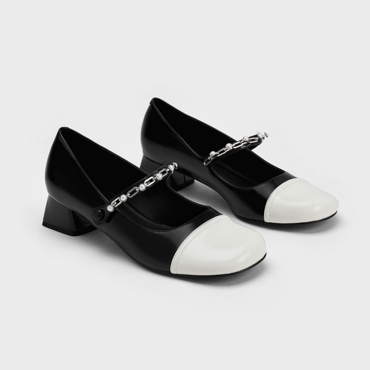 小CK不只有造型感比較強烈的瑪莉珍鞋,如果想找一雙上班、日常都好搭配的瑪莉珍鞋,可以參考這一雙!黑白雙色的拼接、繫帶上的珍珠細節、不高的粗鞋跟,盡顯女孩的優雅氣質!(價格:NT$1,990)