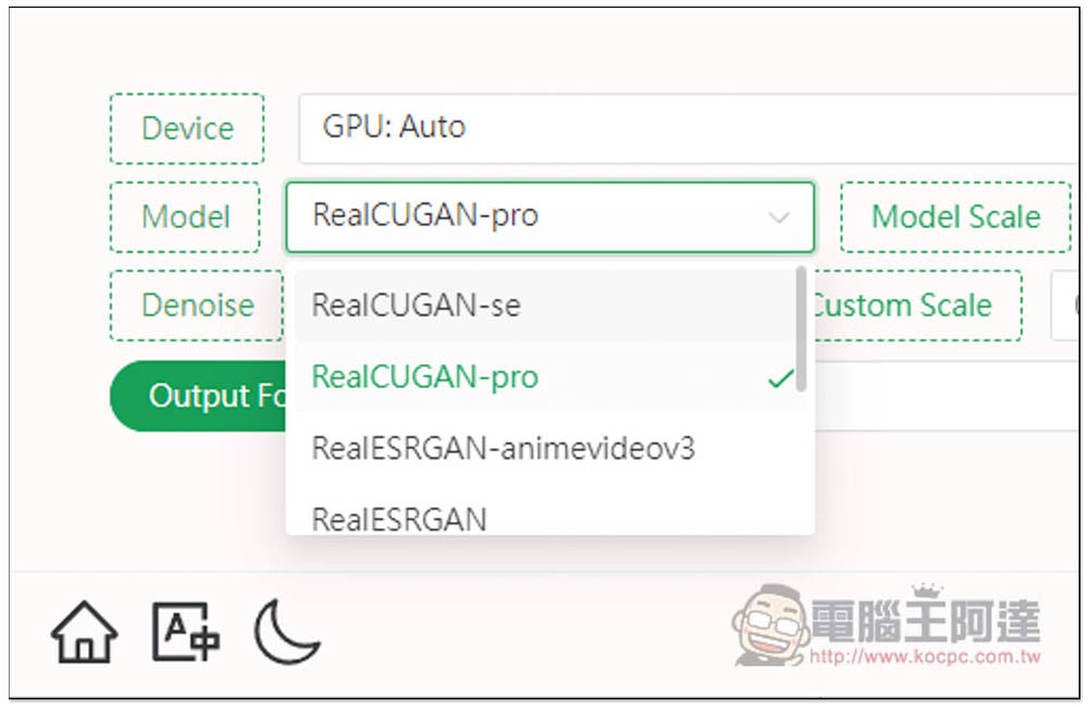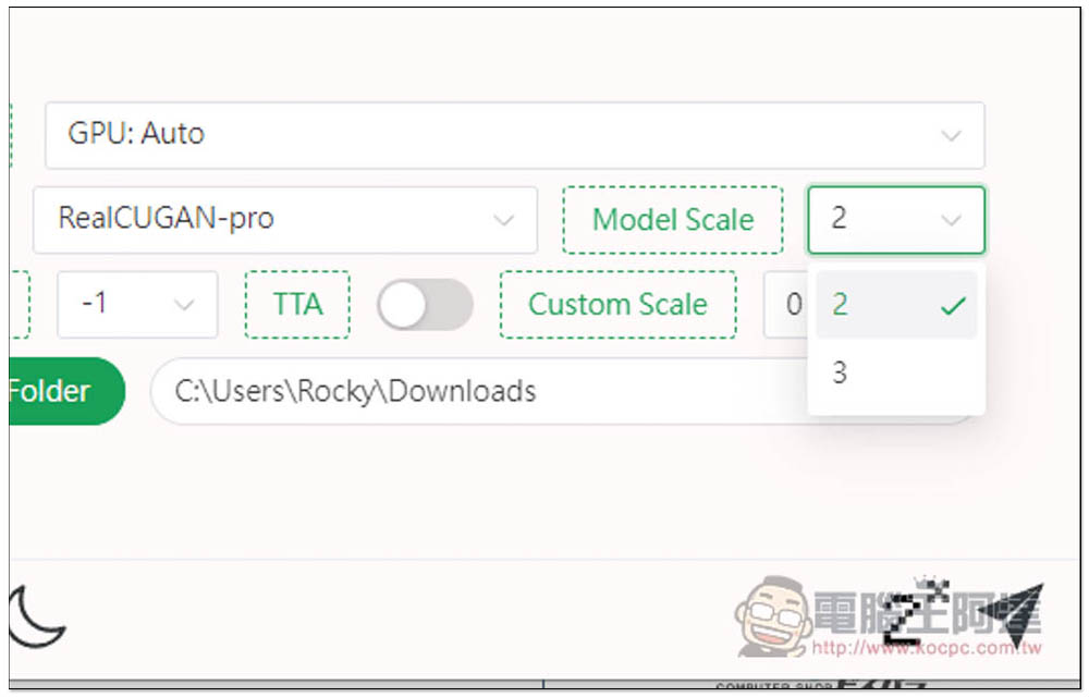 Model Scale 是模型的放大倍數,每個模型支援的放大倍數都不一樣,像 RealCUGAN-pro 有 2 和 3 兩種選擇,SRMD 則提供 2、3、4 三種: