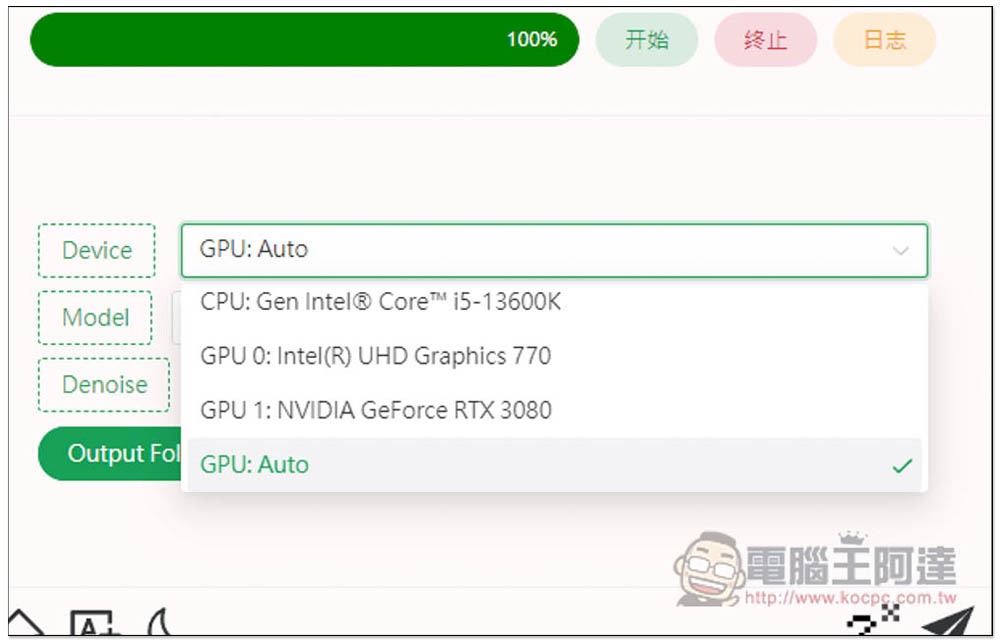 可以改成 CPU,GPU 我有裝 NVIDIA GeForce RTX 3080 獨立顯卡,原本的 i5-13600K 處理器也有內顯,因此我可以指定 GPU 要用哪一個。處理放大時,如果你覺得電腦沒有變很慢之類,那基本上用預設的 GPU:Auto 就好: