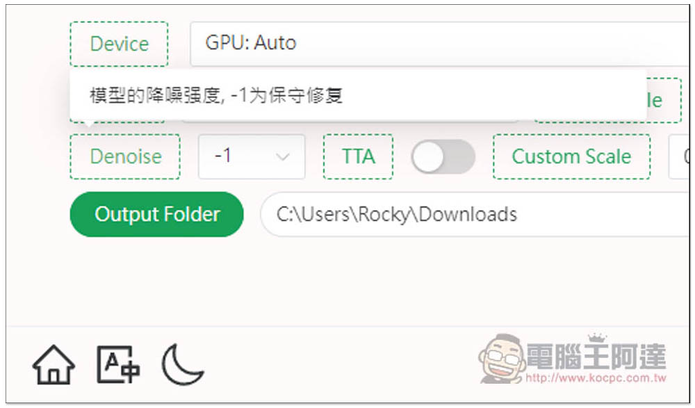 每一個功能如果不知道幹嘛用的,可以將滑鼠移到上方,就會跳出中文解釋,Denoise 是降噪強度: