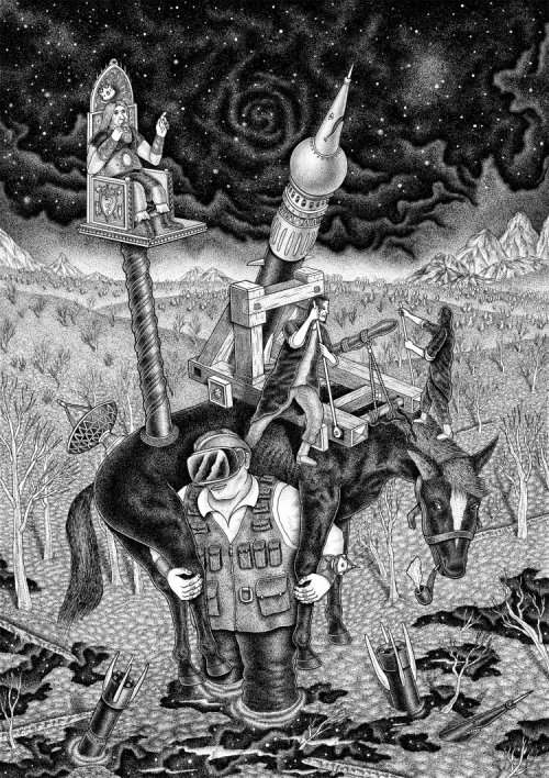 對波蘭藝術家Dima Kashtalyan來說,在創作新作品之前,會仔細考慮要表達觀點的想法、信息和藝術手段。總是透過創作提出一些與現代社會和個人都相關的問題,從眾所周知的物件,並賦予它們非標準的形式和象徵意義。像是這幅畫就以黑白呈現奇幻寫實的感覺,讓人細細品味其中奧妙。