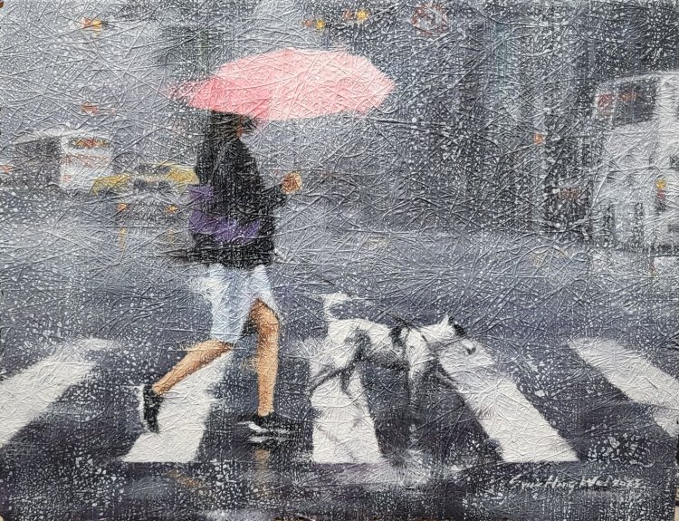 澎湖藝術家薛宏瑋創作的靈感源自出身離島漁村家庭,看魚望海的日子即是生活的一部份,所以作為創作的題材對他來說有著特殊的情感,因此繪製了很多與海有關的作品。在這系列中,主要在嘗試媒材的可能性,以城市雨天街景為題材呈現出畫以外濕度。