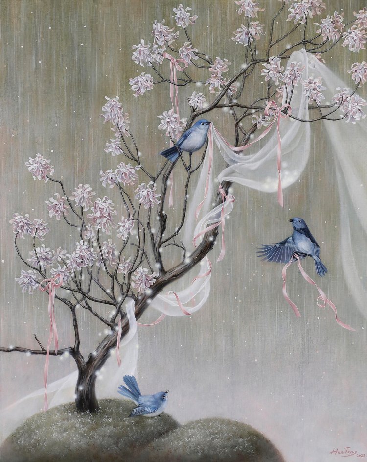 蔡函庭此系列以芙蓉菊為發想,取其避邪護佑的傳統象徵為主軸。畫中的芙蓉菊是凋零枯萎的狀態,卻似仍有著生命與活力,它猶如逝者般的存在、信仰的形象,給與信念和勇氣,守護著在不斷變動的世界中堅強遊走的我們,尋找並構築安身之地的青鳥,給人滿滿的正面能量。