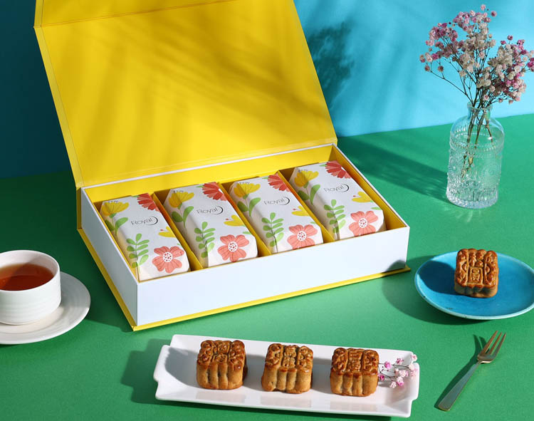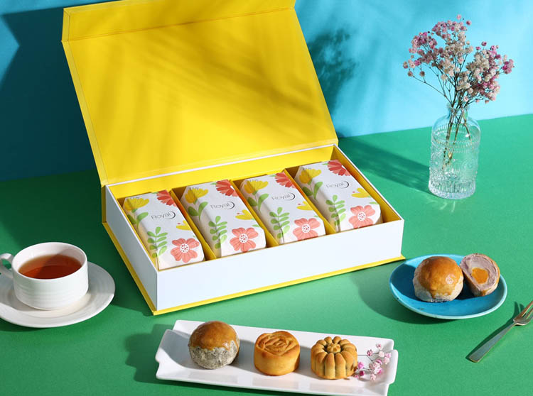 鮮豔花欉的外盒設計,十分吸睛,內盒設計活潑新穎,吸引年輕族群的消費者購買,禮盒內含芝麻核桃蛋黃酥、芋頭麻糬黃金酥、奶黃流心桃山、烏龍茶脆梅桃山,每種口味各2顆,口感層次豐富讓人驚艷。