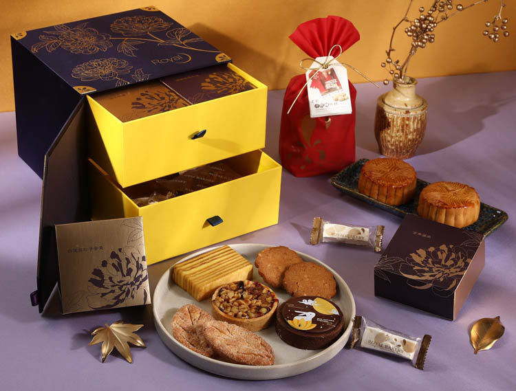 老爺經典雙層推薦款,第一層有四種口味的廣式月餅,包含白蓮蓉松子蛋黃、澄沙奶黃、酒釀桂圓麻糬、古早滷肉月餅,搭配第二層六款老爺烘焙坊主廚林呈憲、精心研發自製烘焙商品,像是夏威夷果仁牛軋糖、中秋巧克力塔、法式葉子派、海鹽焦糖果仁塔、奶油千層蛋糕、杏仁桃酥等,雙層設計中西合璧,是每年最受歡迎的禮盒。